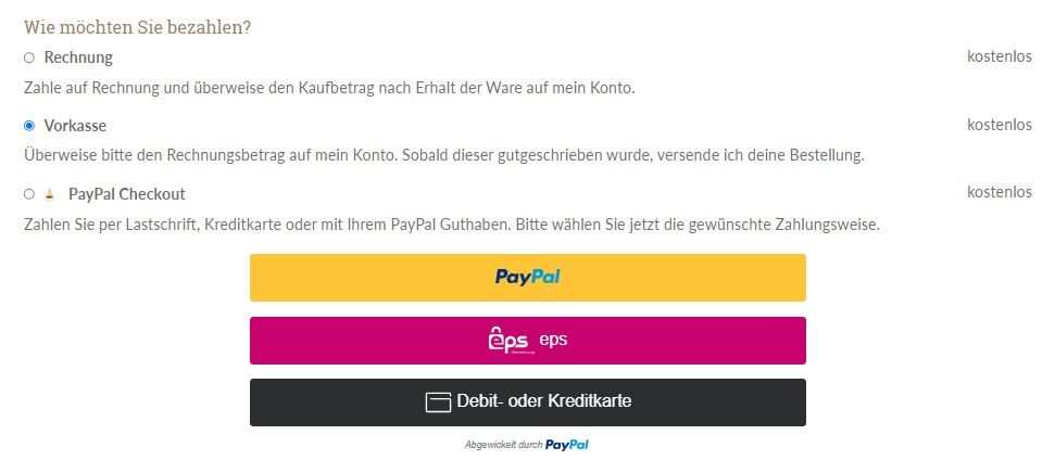 Mit paypal chekout sind Zahlungen mit Paypal, mit deinem ONLINE-Banking (EPS) und mit Debit oder Kreditkarte möglich.
