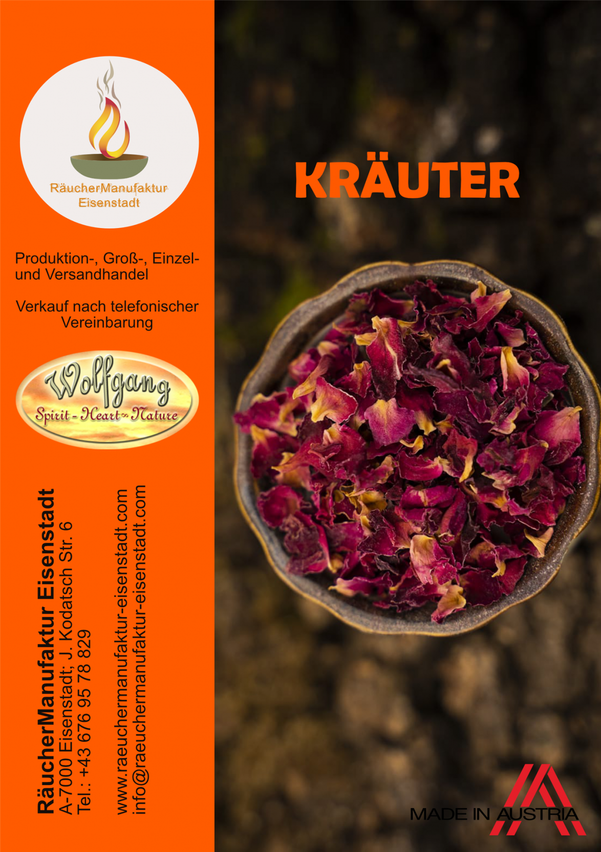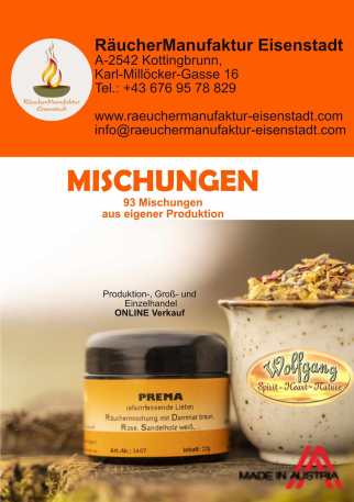Im Katalog RÄUCHERMISCHUNGEN sind alle Räuchermischungen, betreffend Eigenschaft, Bestandteile, Verpackung, Herstellung und Inhalt beschrieben. Die Produktbilder ergänzen die Beschreibungen.