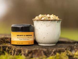 Bestandteile: Bibernellwurzel, Copal weiß, Dammar weiß, Eukalyptusblätter, Ingwer, Lorbeerblätter, Rhododendron Himalaya, Rosmarin, Weihrauch Maidy, Zeder Libanon